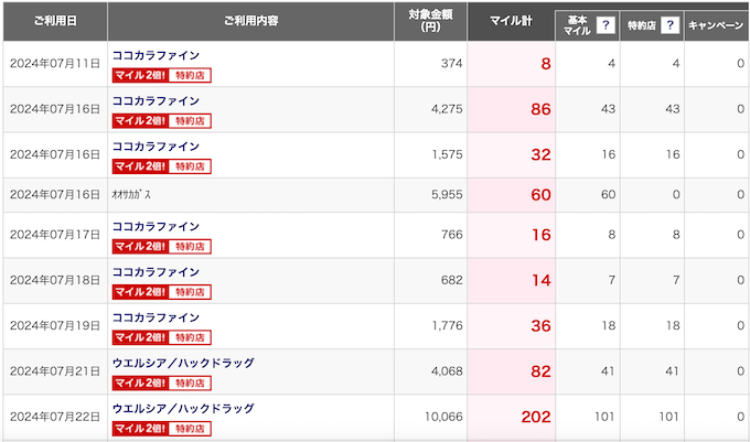 お財布から出ていくお金は同じでも貯まるマイルが2倍多くなるので、特約店を駆使すれば出費は変わらずマイルは貯まりやすくなるわけです。