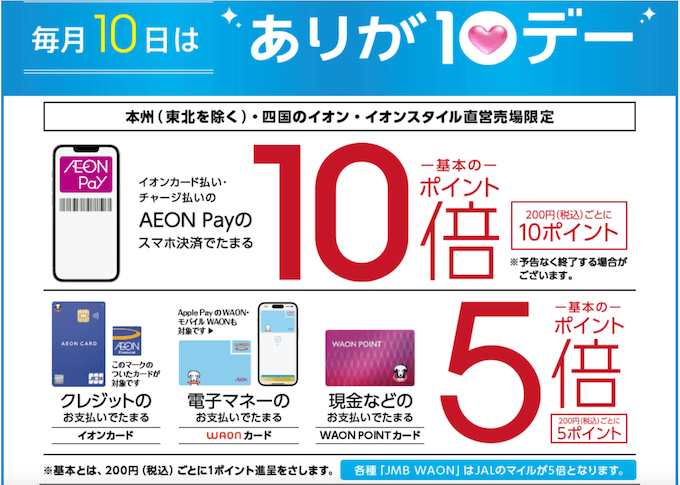 毎月10日に開催されるありが10デーは、JMB WAON払いの還元率が200円=1ptではなく10倍の200円=10ptになります。