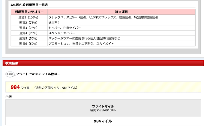ちなみに、東京(羽田)〜沖縄(那覇)まで普通席(積算率100%)で搭乗した場合でも、獲得できるマイル数は片道984マイルで往復してもたったの1,968マイルです(JMB会員・普通席の場合)